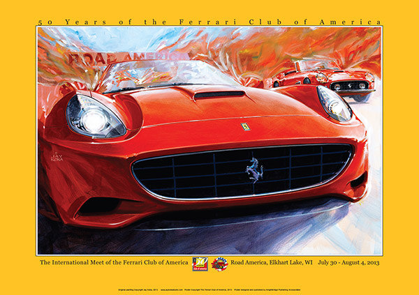 This is one of two paintings that were considered for the Ferrari Club of America 2013 Annual Meet Poster Art and was the art that was finally used. 2013 was the 50th anniversary of the Ferrari Club of America. The event was in late July in Elkhart Lake, Wisconsin. Host hotel was the Osthof Inn and track events were at nearby Road America.