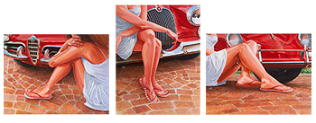 This work began a series of paintings in 2020. Ultimately, four paintings were produced featuring the same model and setting with different automobiles. Part 1 depicts a 1962 Ferrari California. Part 2: 1960 Alfa Romeo Giuletta Spyder, Part 3: 1956 Porsche 356, Part 4: 1959 Jaguar XK150.